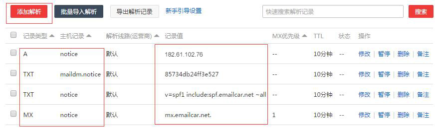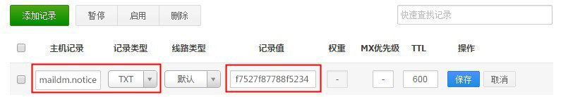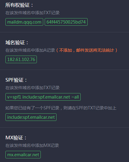 按照邮件推送域名配置的提示信息,添加2条TXT记录、1条A记录,1条MX记录,记录值为页面上提示的信息,参考如下: